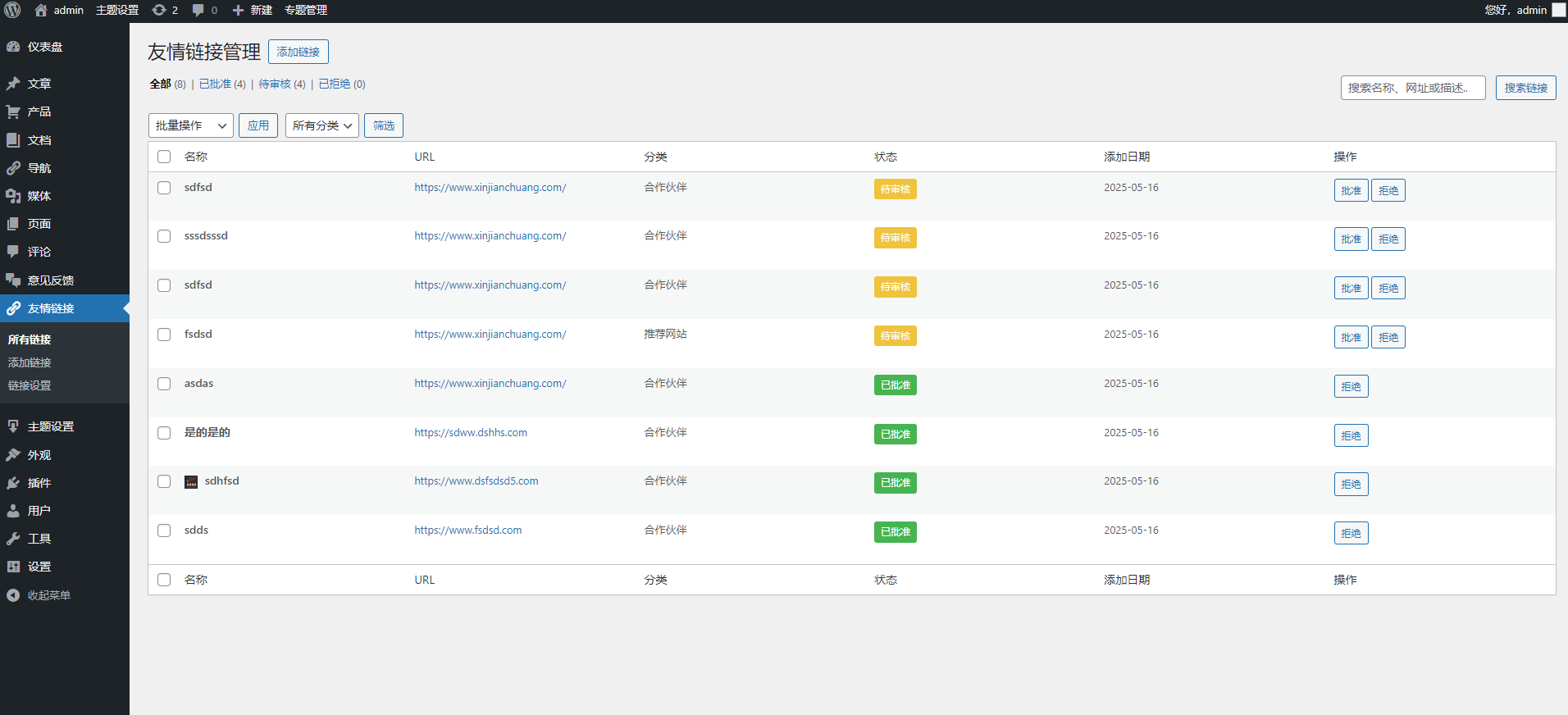 新增友情链接页面,支持前端用户在线提交申请,后台审核